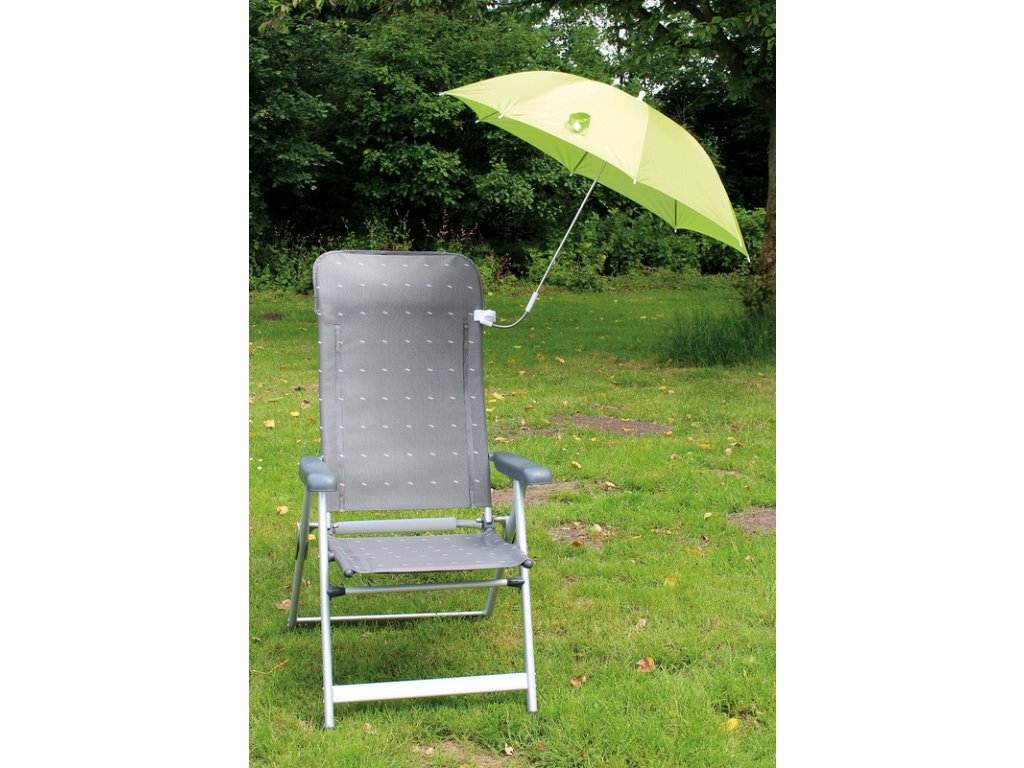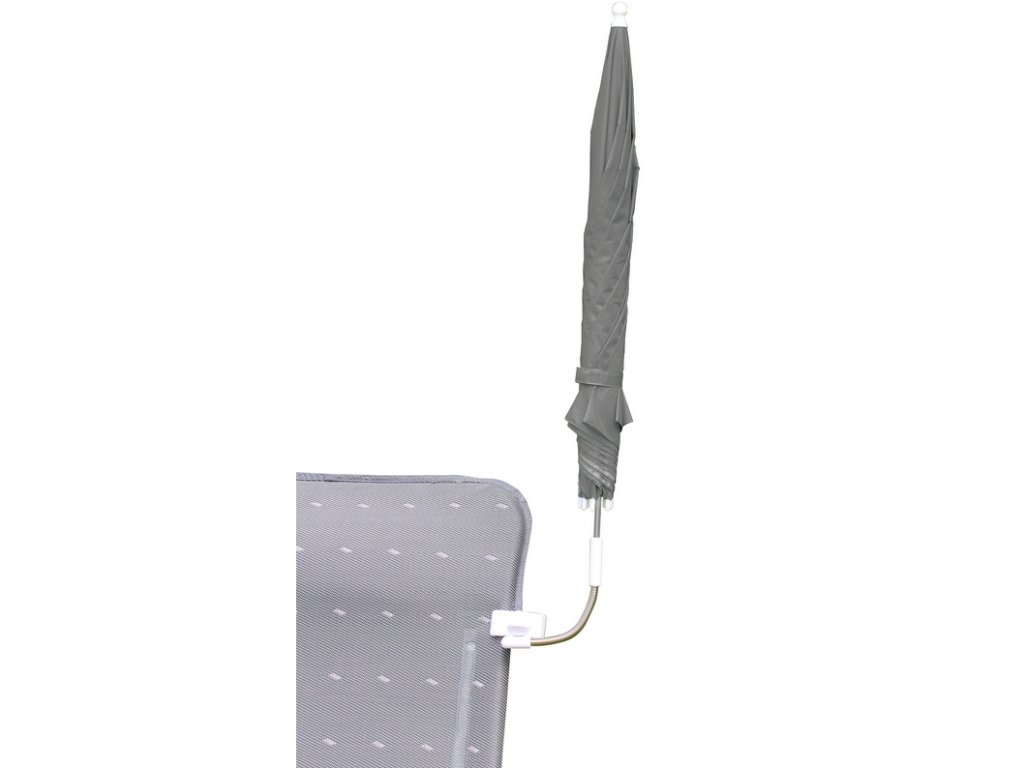 Slunečník se upevňuje pomocí malého svěráku, který je součástí balení. Tento svěrák umožňuje pevné uchycení slunečníku na konstrukci křesla nebo lehátka, přičemž ocelová tyč o průměru 8 mm a maximálním průměru uchycení až 2,8 cm zaručují stabilitu a bezpečnost. Ohebná část slunečníku vám umožní snadno nastavit jeho úhel a směr, čímž si zajistíte ideální zastínění bez ohledu na polohu slunce.