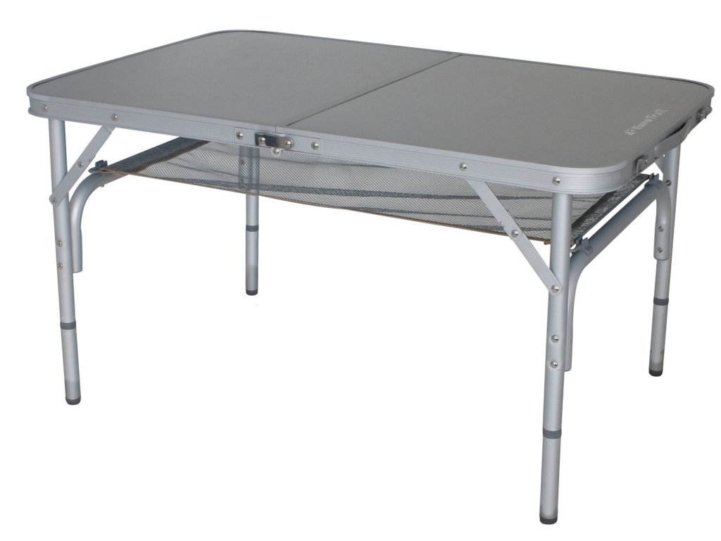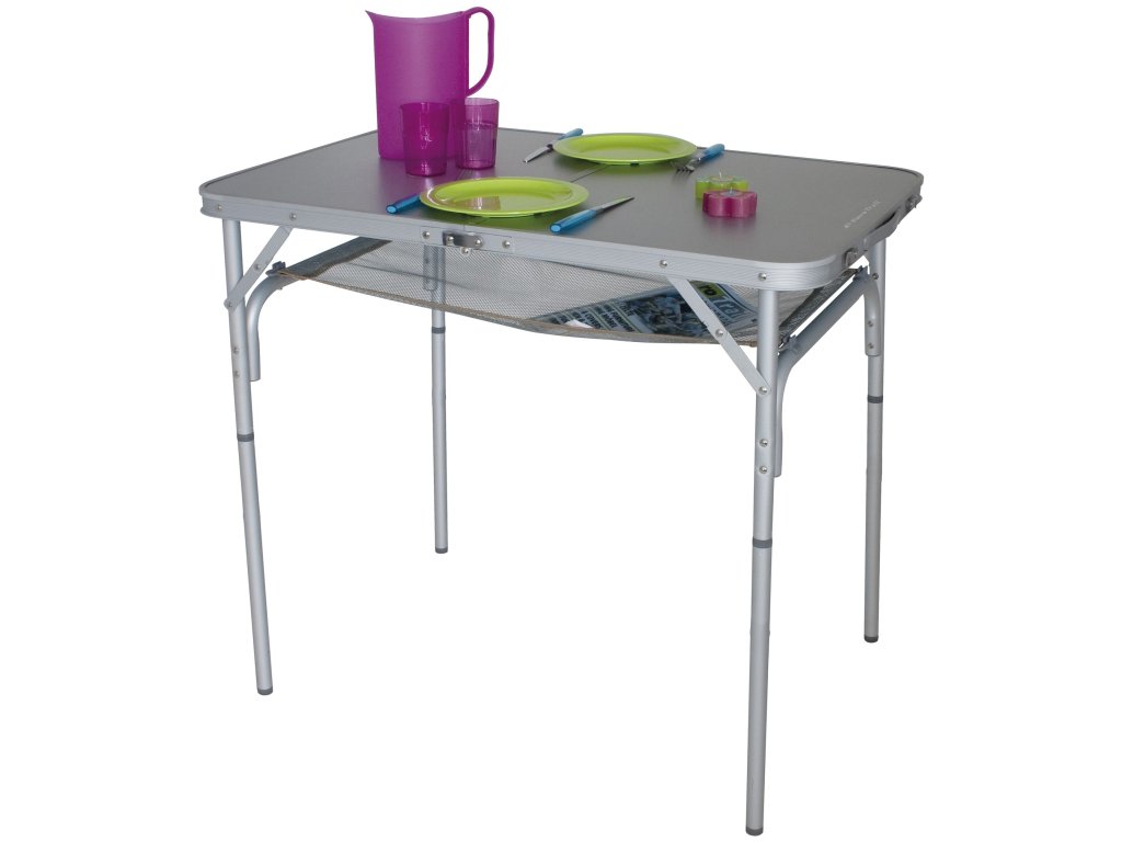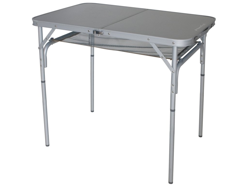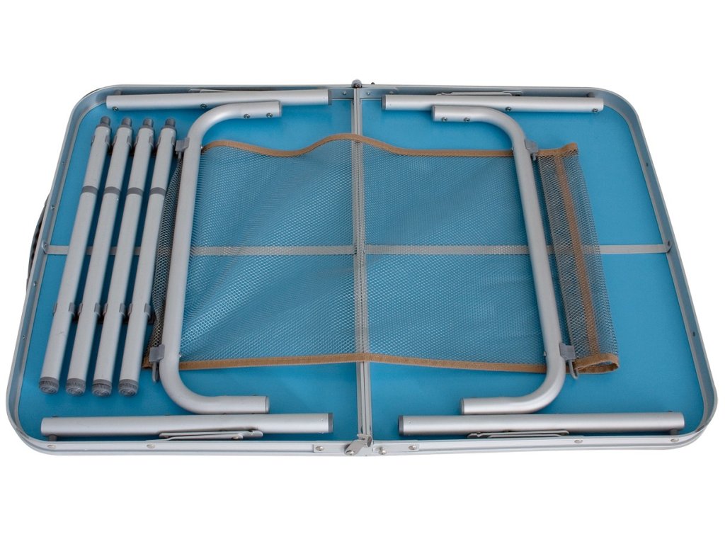Stůl je postaven na hliníkovém rámu, který je odolný a lehký, což znamená, že je nejen stabilní, ale i snadno přenositelný. Šroubovací nohy, které jsou složeny ze dvou oddílů, umožňují nastavit stůl na požadovanou výšku, což přispívá k jeho stabilitě i na nerovném terénu. Tento design je ideální pro použití ve všech venkovních podmínkách, kde je důležitá stabilita i mobilita.