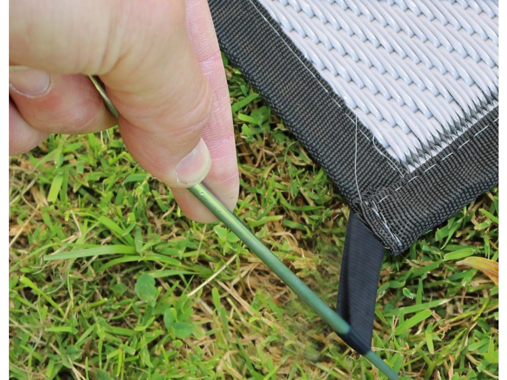 Poutka pro snadné uchycení: Koberec je vybaven našitou poutkou v rozích, která usnadňuje uchycení pomocí kolíků. Tento jednoduchý systém zajišťuje, že koberec zůstane pevně na svém místě, i když je vítr nebo pokud máte na něm více lidí. Poutka přinášejí praktické řešení pro stabilní uchycení.