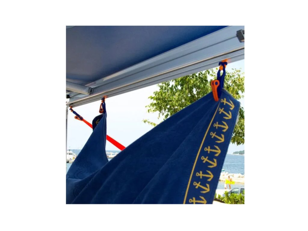 - Celý tento systém pak umožňuje uchycení čehokoli (ručníky, drobné předměty…) na přední lištu markýzy.
