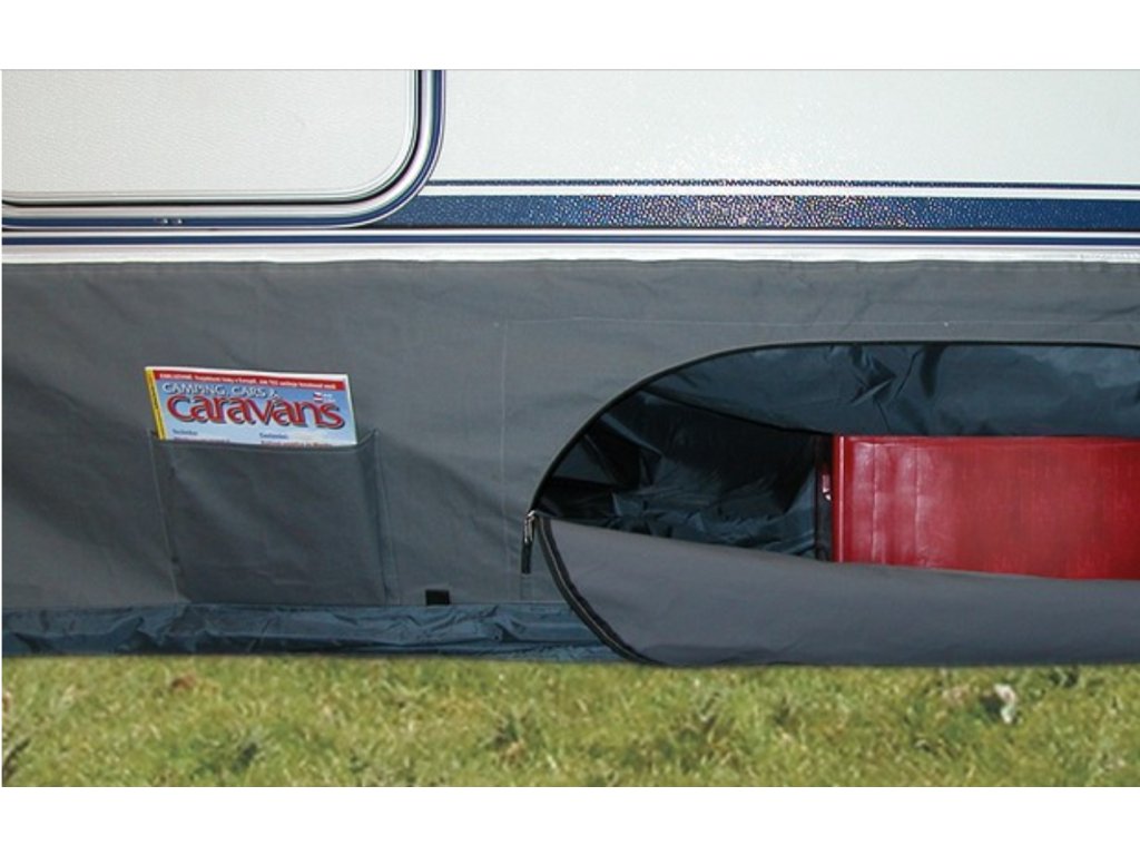 Přístup do prostoru pod karavanem: Zástěna obsahuje zipy, které umožňují otevřít chlopně a získat přístup do prostoru pod karavanem. Tato funkce je skvělá pro uskladnění dalších věcí nebo pro údržbu podvozku karavanu bez nutnosti se ohýbat nebo se obtěžovat s těžkými kryty.