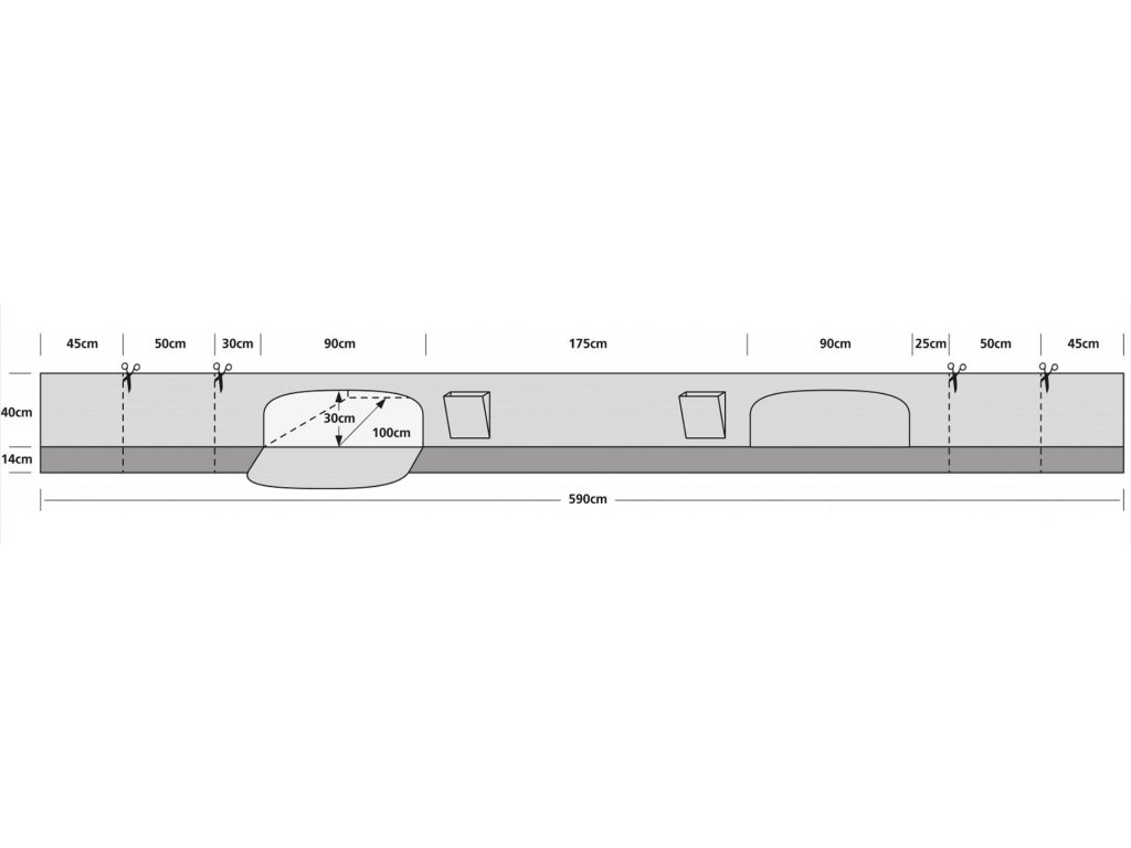 - Rozměry: 590 × 40 cm + 14 cm sněhový límec