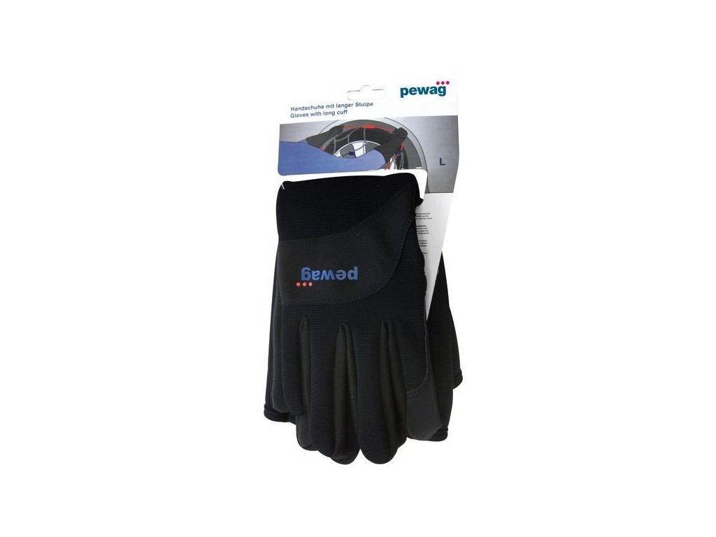 Rukavice jsou vyvinuty podle designérské předlohy Pewag s dlouhou manžetou. Kombinace materiálů elastanu, fleecu, umělé kůže a PVC zaručují komfortní pocit při nošení, ochraňují ruce a oblečení při montáži řetězů před mokrem a špínou, zároveň nabízejí protiskluzový povrch.