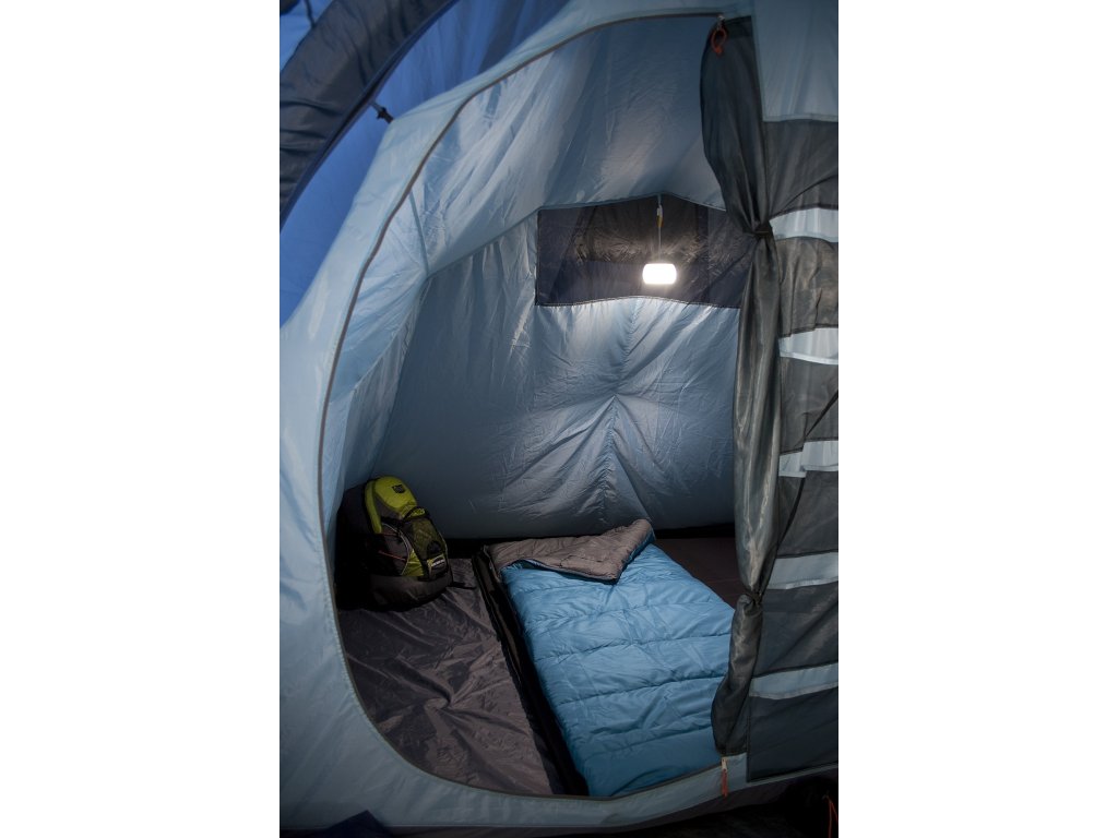 Svítidlo je napájeno třemi LED žárovkami, které poskytují dostatečně silné, ale přitom jemné světlo, což zajišťuje příjemnou atmosféru ve stanu nebo při večerní relaxaci pod širým nebem. Nabízí tři režimy svícení, které můžete snadno přepínat podle vašich potřeb: vypnuto, měkčí světlo a ještě jemnější světlo. Tento flexibilní režim vám umožní přizpůsobit intenzitu světla pro různé situace – ať už potřebujete jemné světlo pro čtení nebo intenzivnější osvětlení pro práci nebo přípravu jídla.