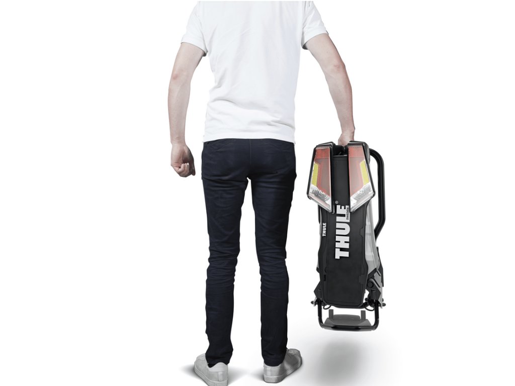 I při naložených kolech umožňuje tento nosič snadný přístup do zavazadlového prostoru díky systému sklápění ovládanému nožním pedálem. Navíc je vybaven ergonomickou rukojetí pro pohodlné přenášení.