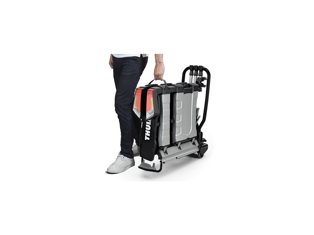 I při naložených kolech umožňuje tento nosič snadný přístup do zavazadlového prostoru díky systému sklápění ovládanému nožním pedálem. Navíc je vybaven ergonomickou rukojetí a kolečky pro pohodlné přenášení.