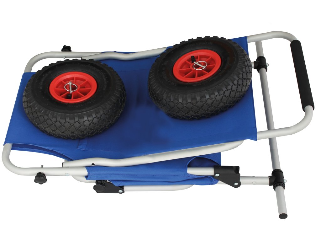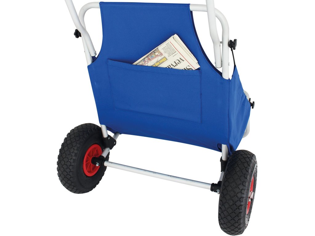 Kromě praktického využití pro přepravu věcí, tento vozík slouží také jako komfortní místo k sezení. Díky pevné hliníkové konstrukci a modrému polyesteru nabízí vozík stabilní a pohodlný podklad pro odpočinek. Ať už si chcete na chvíli odpočinout při výletu nebo relaxovat na pláži, tento vozík vám poskytne pohodlné sezení, které snadno přenesete kamkoliv.